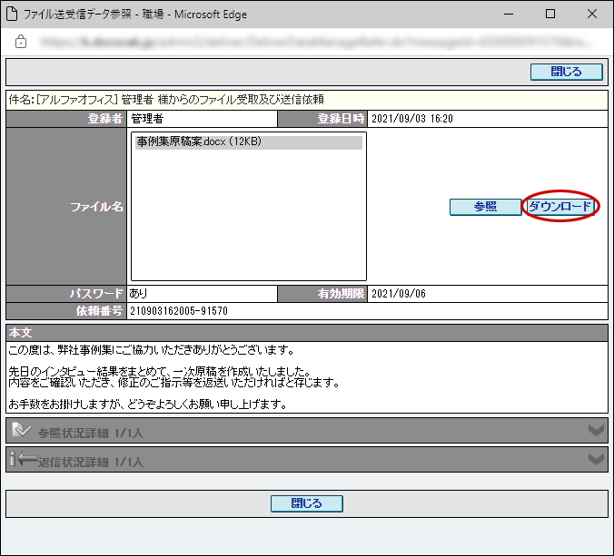 ファイル送受信データ参照画面で、依頼先に送ったファイルをダウンロードすることができます。