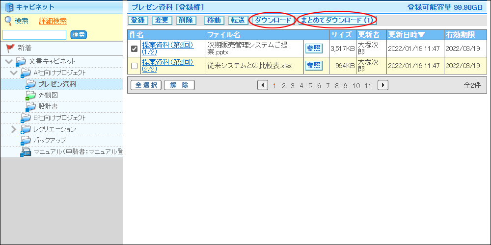 ※キャビネットのファイルをすべてダウンロードするときは→「一括ダウンロード」
