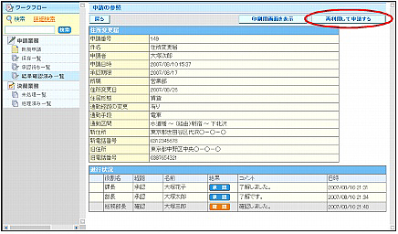 各一覧の画面から再利用したい申請書を表示し、「再利用して申請する」ボタンをクリックすると、選択した申請書と同じ内容が入力された申請書が表示されます。以降の操作は、「新規の申請を出す」の手順3~7をご覧ください。