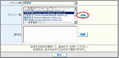 ※「通知先」でメールアドレスを選択して「削除」ボタンをクリックすると、メールアドレスが削除されます。