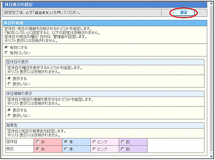 | 休日の有効 | 定休日や祝日を表示するかどうかを選択します。 |
